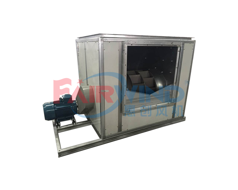 HTFC-V型離心風機是一種葉片后傾的柜式離心風機。產品由KDF離心風機、電機、軸承、消聲型箱體等部件組成。為滿足用戶不同的安裝需要,提供12種不同角度的進出風口方案。此系列產品結構形式分為A型、B型兩種:A型電機裝在箱體外側,用于消防排煙,產品經國家防火建筑材料質量監督檢驗中心按GA211-2009《消防排煙風機耐高溫實驗方法》檢驗合格,并通過公安部消防產品合格評定中心中國國家強制性產品3C認證;B型電機裝在箱體內部,用于通風換氣。